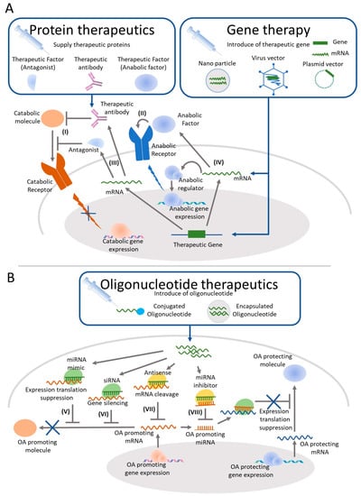 Current and potential targets of DMOADs for IA injection. (A) Current drug targets of protein therapeutics candidates for OA aim to block the interaction between proinflammatory cytokines and their receptors (I) or to supply cartilage protective proteins to the joint (II). The attempts of gene therapy candidates aim to supply proteins, which have anti-inflammatory (III) or cartilage repair effects (IV) instead of IA administration of recombinant protein. (B) OA progression may be controlled by reducing the protein production involved in pathological conditions through expression translation suppression by miRNA (V), gene silencing by siRNA (VI), or mRNA cleavage by antisense (VII). MicroRNA inhibitors inhibit OA promoting miRNAs (VIII) and may restore the expression of OA protecting proteins and may contribute to suppress OA progression.