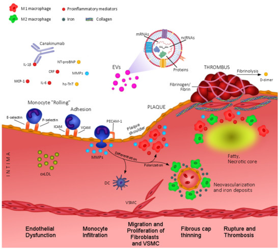 Circulating biomarkers in atherosclerosis and PAD pathophysiology. At early stages of atherosclerosis, endothelial dysfunction leads to increased levels of proinflammatory cytokines (IL1β, IL6, CRP, MCP-1), extracellular vesicles (EVs), proteases (MMPs), and adhesion molecules (E-selectin, P-selectin, ICAM, VCAM,) that contribute to monocyte recruitment and infiltration into the intima. Microenvironmental factors such as MMPs orchestrate plaque progression by regulating macrophage polarization towards proinflammatory (M1) or anti-inflammatory (M2) phenotypes, which are predominantly located in unstable areas (i.e.,: plaque shoulder) or neovascularization regions, respectively. In advanced lesions, inflammatory factors and MMPs exacerbate fibrous cap thinning and contribute to plaque instability, rupture, and formation of fibrin clot. Extracellular vesicles (EVs), mainly of platelet origin, also participate in thrombus formation according to the exposure of procoagulant factors (e.g.,: tissue factor and phosphatidylserine). In addition, reduced tissue perfusion due to arterial stenosis and thrombosis might cause increased levels of tissue damage-related biomarkers such as NT-proBNP or hs-TnT. CRP, C reactive protein; DC, dendritic cells; ICAM, intercellular adhesion molecule; IL, interleukin; MCP-1, monocyte chemoattractant protein; MMPs, matrix metalloproteinases; NT-proBNP, N-terminal pro-brain natriuretic peptide; oxLDL, oxidized Low Density Lipoproteins; hs-TnT, high sensitivity troponin T; VCAM, vascular cell adhesion molecule; VSMC, vascular Smooth Muscle Cells.