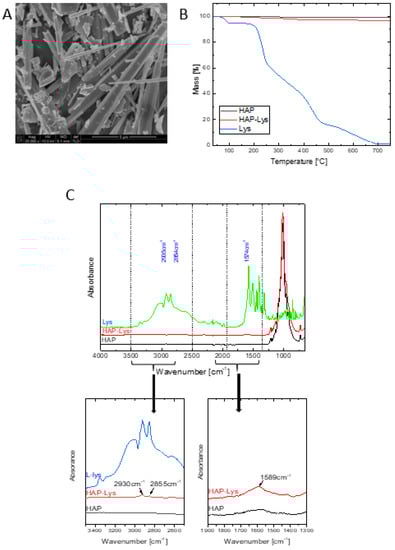 3.2. Apatite Whiskers (HAP) Synthesis and Modification with l-Lysine