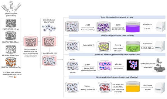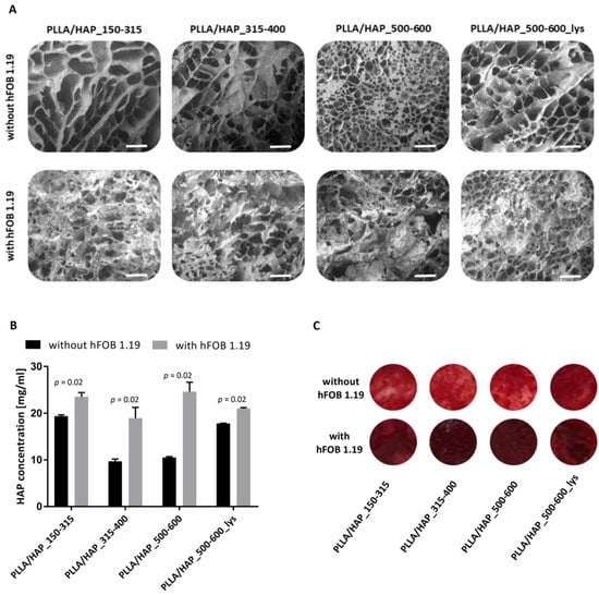 Szustakiewicz, K.; Włodarczyk, M.; Gazińska, M.; Rudnicka, K.; Płociński, P.; Szymczyk-Ziółkowska, P.; Ziółkowski, G.; Biernat, M.; Sieja, K.; Grzymajło, M.; et al. The Effect of Pore Size Distribution and l-Lysine Modified Apatite Whiskers (HAP) on Osteoblasts Response in PLLA/HAP Foam Scaffolds Obtained in the Thermally Induced Phase Separation Process. Int. J. Mol. Sci. 2021, 22, 3607. https://doi.org/10.3390/ijms22073607