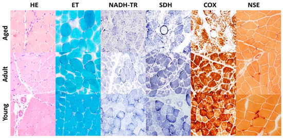 Representative histological sections of skeletal muscle from aged, adult and young cows. Aged cow (group A): Hematoxylin and eosin (HE) stain shows moderate variability in muscle fiber size, with atrophic fibers occasionally showing angular profile and a mild, chronic, lymphopcytic inflammatory infiltrate within the endomysium. Engel trichrome (ET) stain shows muscle fibers showing subsarcolemmal mitochondrial accumulations (ragged red fibers). Nicotinamide adenine dinucleotide tetrazolium reductase (NADH-TR) stain shows deep blue ragged blue fiber and “moth-eaten” fibers displaying moderate to severe irregular disruption of myofibrillar network. Succinate dehydrogenase (SDH) stain shows ragged blue fiber deeply stained in blue. COX stain shows a cytochrome oxidase (COX)–negative fiber and many others showing a detectable decrease of COX activity. Nonspecific esterase (NSE) stain shows muscle fibers presenting small, pale, and multisegmented neuromuscular junctions. Adult cow (group B): Hematoxylin and eosin (HE) shows mild to moderate variability in muscle fiber size and multiple disseminated atrophic fibers. Engel trichrome (ET) shows mild to moderate subsarcolemmal mitochondrial accumulations (ragged red fibers). Nicotinamide adenine dinucleotide tetrazolium reductase (NADH-TR) stain shows a mild irregular disruption of myofibrillar network. deeply stained in blue. Succinate dehydrogenase stain (SDH) stain shows few ragged blue fibers with mild mitochondrial accumulation. COX stain shows mild detectable decrease of COX activity. Nonspecific esterase (NSE) stain shows muscle fibers displaying small, pale, and multisegmented neuromuscular junctions. Young cow (group C): Normal muscle fibers with no remarkable lesions.