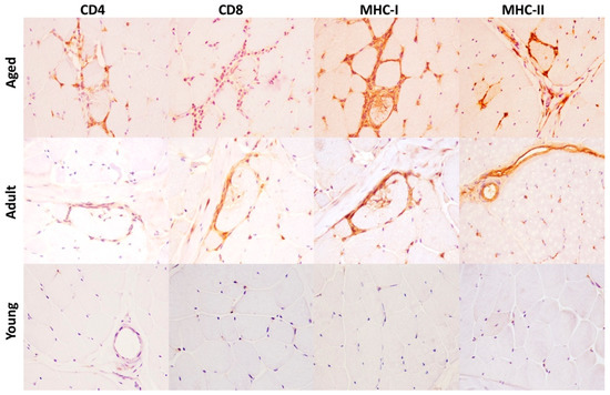 Immunohistochemical staining for CD4, CD8, MHC-I and MHC-II in skeletal muscle of aged, adult and young cows. Aged cows (Group A): there is a mild to moderate inflammatory infiltrate in the endomysium consisting mostly in CD8+, rare CD4+ T cells. Scattered muscle fibers show sarcolemmal immunolabeling for MHC-I and MHC-II antibodies. HRP method with Mayer’s hematoxylin counterstain. Adult cows (Group B): there is a mild inflammatory infiltrate in the endomysium consisting mostly in CD8+, rare CD4+ T cells. Scattered muscle fibers show sarcolemmal immunolabeling for MHC-I, but not for MHC-II antibody. HRP method with Mayer’s hematoxylin counterstain. Young cows (Group C): no inflammation is detectable and there is absence of MHC-I and MHC-II immunolabeling on muscle fibers. HRP method with Mayer’s haematoxylin counterstain.