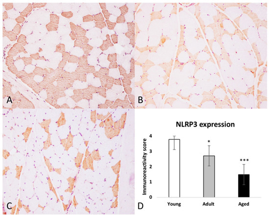 Immunohistochemical expression of NLRP3 in skeletal muscle in cows. (A) Aged cows (Group A), (B) Adult cows (Group B), (C) Young cows (Group C). HRP method with Mayer’s hematoxylin counterstain. (D) Immunoreactivity score for NLRP3 expression. There is a statistically significant negative association between age and the presence of NLRP3 immunolabeled muscle fibers. Each value is the mean ± SEM (* p < 0.05; *** p < 0.001).