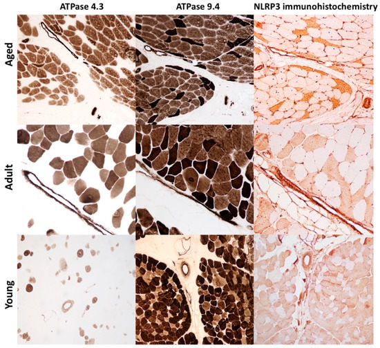 Immunohistochemistry was performed to assess (1) the expression of MHC-I and MHC-II in skeletal muscle and to identify lymphocyte subtypes in inflammatory infiltrate and (2) to evaluate the expression and distribution of the NLRP3 inflammasome in skeletal muscle of aged, adult and young bovine. Lymphocyte subtypes were identified based on the staining patterns of antibodies against specific cell surface proteins. In all skeletal muscles from aged bovine, inflammatory cells had an endomysial, perimysial, and sometimes perivascular distribution and they were positive for T cells subtypes, mostly CD8 and rarely CD4 (Figure 2). Scattered MHC I–positive and MHC-II muscle fibers were observed in aged and adult group (Figure 2). In samples from young group, anti–MHC I and anti-MHC II antibodies showed positive immunolabelling only on vessels in perimysium and endomysium (Figure 2). NLRP3 immunoreactivity was observed in every group as a diffuse, brown, sarcoplasmic positivity. Moreover, there was a statistically significant negative association between age and number of NLRP3-labeled myofibers (* p < 0.05; *** p < 0.001) (Figure 3A–D). NLRP3 immunoreactivity was detected exclusively in type II glycolytic fibers (Figure 4).