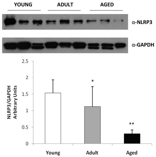 Analyses were performed with GraphPad (version 5.03; GraphPad Software Inc., La Jolla, CA, USA ). A one-way analysis of variance was performed to compare the overall level of NLRP3 inflammasome labeling among age groups. The post-hoc tests employed were t tests for two samples assuming unequal variances. Data obtained from western blot analysis and RT-PCR were analyzed with Statview software (Abacus Concepts, SAS Institute Inc., Cary, NC, USA) by Student’s t test. Blots were revealed by enhanced chemiluminescence and autoradiography using GAPDH as a loading control. The autoradiographs shown are representative of four independent experiments. Bars represent the mean ± SD (standard deviation) of four independent experiments. For all experiments, p < 0.05 was considered statistically significant.