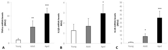 Changes of TNF-α, IL-1β and IL-18 levels in skeletal muscle were measured with RT-PCR analysis. Our results showed that TNF-α, IL-1β and IL-18 levels were differently expressed in the three groups and they were increasingly higher from young to mature to aged animals (Figure 6). TNF-α levels were very low in young cows (Group C) and increasingly higher in adult to aged animals (** p < 0.01; *** p < 0.001 vs. control). IL-1β levels were increasingly higher from young cows (Group C) to adult and aged animals (Group B and A, respectively) (* p < 0.05 vs. control). IL-18 levels were very low in young cows (Group C) and increasingly higher in adult to aged animals (Group B and A, respectively) (* p < 0.05; *** p < 0.001 vs. control).