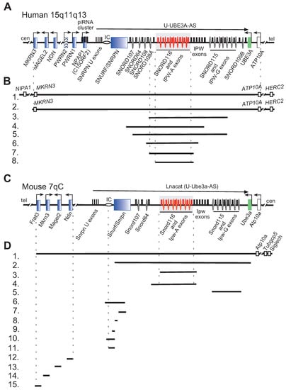 Imprinted SNORD small nucleolar RNAs (snoRNAs) within the PWS-locus were originally identified two decades ago []. Based on the presence of conserved C and D sequence motifs, these snoRNAs were assigned to the subclass of 2′-O-methylation guide C/D box snoRNAs. However, due to the apparent lack of any significant complementarities to classical snoRNA target molecules (rRNAs, snRNA) they are referred to as “orphan” snoRNAs []. The human PWS region harbors seven SNORD genes and families: SNORD107, SNORD64, SNORD108, SNORD109A, SNORD116, SNORD115 and SNORD109B. The corresponding mouse locus contains the orthologous genes Snord107, Snord64, Snord116 and Snord115. Most snoRNAs from the PWS-locus are processed from introns of a long primary non-protein coding U-UBE3A-AS transcript (U-Ube3a-AS in mouse) (Figure 1). Both the human and murine genes are paternally imprinted. In human, SNORD116 and SNORD115 genes represent tandemly repeated arrays comprised of 29 and 48 copies, respectively []. SNORD116 copies are located within introns flanked by the repetitive IPW-A exons of the U-UBE3A-AS transcript (Figure 1A). SNORD115 copies are embedded between repetitive IPW-G exons (Figure 1A). In mice, 66 copies of Snord116 are distributed in the introns of 67 Ipw-A exons (Figure 1C). However, due to an assembly gap of approximately 50 kb inside the mouse Snord116 region, the exact number of repeats is yet to be determined. Although SNORD116 displays a high degree of sequence similarity between different mammalian species [], conventional targets on rRNAs cannot be identified [,]. In rodents, expression of the PWS locus encoded snoRNAs is restricted to neurons, while in humans they are most abundant in brain but also expressed in other tissues [].