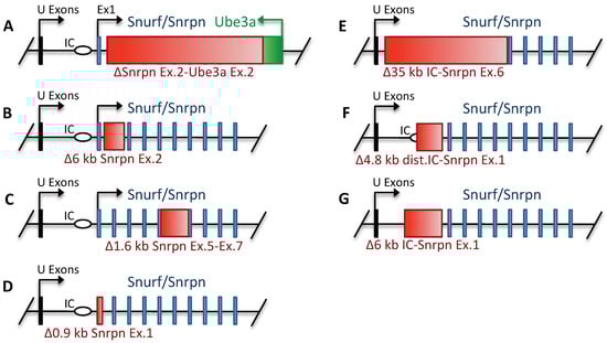 Schematic representation of genetically engineered mouse models harboring deletions within Snurf/Snrpn and PWS IC center (drawings are not to scale). Green and thin blue rectangles denote Ube3a and Snurf/Snrpn CDS exons, respectively. The red rectangles indicate generated genomic deletions. Thin black rectangles show location of U-exons; the imprinting center (IC) is denoted by a horizontal oval. (A). Large deletion of the genomic region between Snurf/Snrpn exon 2 and Ube3a exon 2. []. (B). Inactivation of the Snurf ORF by deleting the 6 kb region including Snurf/Snrpn exon 2 []. (C). Intragenic deletion of 1.6 kb within Snurf/Snrpn including exon 6 and parts of exons 5 and 7 disrupting the Snrpn ORF []. (D). Small 0.9 kb deletion of the major Snurf/Snrpn promoter together with first CDS exon []. (E). The PWS IC deletion, spanning 35 kb (originally described as 42 kb) including Snurf/Snrpn exons 1–6 []. (F). Deletion of 4.8 kb (later revealed to be 5.07 kb in size) genomic region, including Snurf/Snrpn exon 1 and the distal part of the PWS IC []. (G). The 6 kb deletion comprising PWS IC and Snurf/Snrpn exon 1 [].