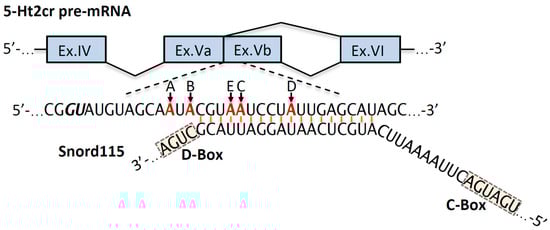 - Raabe, C.A.; Voss, R.; Kummerfeld, D.-M.; Brosius, J.; Galiveti, C.R.; Wolters, A.; Seggewiss, J.; Huge, A.; Skryabin, B.V.; Rozhdestvensky, T.S. Ectopic expression of Snord115 in choroid plexus interferes with editing but not splicing of 5-Ht2c receptor pre-mRNA in mice. Sci. Rep. 2019, 9, 4300. [Google Scholar] [CrossRef] [PubMed]