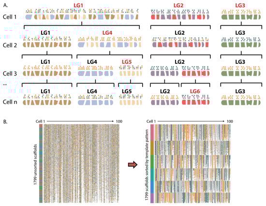 Clustering scaffolds based on strand inheritance. (A) Schematic for clustering 6 chromosomes. Each chromosome pair will harbor one of three template inheritance states: WW, WC, or CC (W = blue, C = orange). Through analysis of the template inheritance pattern of multiple cells, scaffolds from the same chromosome share the same pattern and can be resolved. For example, in Cell 1, three chromosomes are represented in linkage group 1 (LG1), but are resolved in subsequent cells. (B) Subsetted data showing 1799 unsorted ferret scaffolds belonging to six linkage groups across 100 cells (CC = blue, WW = orange, WC = grey, no data = white). Prior to clustering (left plot), scaffolds from the same chromosome are unknown, while after clustering (right plot), scaffolds that share template inheritance patterns across individual cells are resolved. Vertical color bar represents called members for each of the six linkage groups.