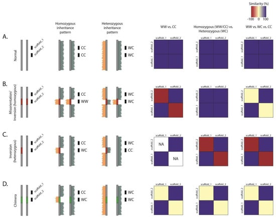 The effect of different assembly errors or structural variation on clustering. Different errors will generate characteristic patterns in the clustering data. Consider two scaffolds in close proximity on a chromosome, scaffold_1 and scaffold_2. (A) In a case where both scaffolds are oriented in the same direction, the scaffolds will have the same strand-state patterns. When comparing homozygous patterns (WW scaffolds against CC scaffolds), heterozygous patterns (WW or CC scaffolds against WC scaffolds) or comparing all three strand states against each other, there will be high similarity. (B) In the case of a misorientation (or a homozygous inversion), the strand-state patterns will be antithetical when comparing homozygous states, as whenever scaffold_1 is WW, scaffold_2 will be CC, and as such, these scaffolds will be completely dissimilar. However, since misorientations are not visualized in heterozygous inheritance patterns, when comparing WW or CC states against WC states, the scaffolds are highly similar. When comparing all three states against each other, the similarity seen with WC scaffolds and dissimilarity seen with WW or CC scaffolds will cancel out, resulting in ~50% similarity. (C) In cases of a heterozygous inversion, either scaffold_1 or scaffold_2 may have a homozygous state, but not both. Therefore, no comparisons can be made when only considering the homozygous states, and NA values are generated. There will, however, be a high degree of dissimilarity when comparing homozygous and heterozygous states. It is important to distinguish these natural structural variants from assembly reference errors. (D) In cases where a scaffold is incorrectly located to a chromosome (i.e., a chimera), the inheritance pattern between the two scaffolds will be random, and there will be no significant similarity or dissimilarity between these scaffolds.