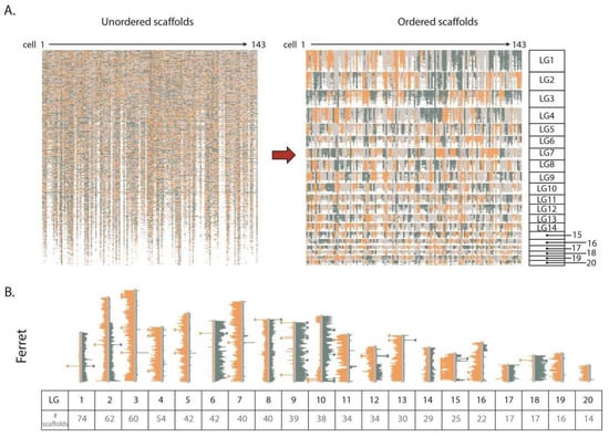 For each scaffold assembly, the majority (>90%) of fragments clustered together into the same number of LGs as there are chromosomes from that organism (Figure 1). For example, for the ferret genome (20,XX), 97.9% of the assembly fragments mapped to the 20 largest LGs (Figure 4, Supplementary Figure S3). Each of these 20 groups represent scaffolds that have been correctly oriented and show co-inherited strand states, consistent with them belonging on the same chromosome. Similarly, 90.9% of Guinea pig (32,XX) scaffolds mapped to the 32 largest LGs (Supplementary Figures S3 and S4), and 90.4% of Tasmanian devil (7,XY) assembly fragments mapped to 7 LGs (Supplementary Figure S5). Since unlocalized and unplaced fragments are not tethered to whole chromosome scaffolds, the orientation of these fragments was expected to be mostly random.