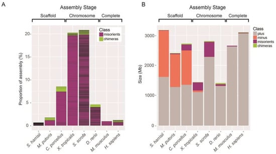 Of these six organisms we used for enhancing genome references, the pig (S. scrofa) was selected for its significance in agriculture and in medicine, as well as in understanding evolution during animal domestication. Most of the sequence (92%, 5344 scaffolds), has been ordered into the 20 chromosomes, with a further 4562 scaffolds remaining unplaced. However, this assembly still contains 69,541 spanned and 5323 unspanned gaps []. Since there is no underlying information on the orientation of scaffolds separated by unspanned gaps (which have no supporting evidence for the orientation of the contigs they flank), this would suggest that at least some of the scaffolds are incorrectly oriented. Genome references of many other important model organisms also built on the chromosome-level contain multiple gaps and unplaced fragments. For example, the zebrafish (D. rerio) is an important model in vertebrate development and gene function, and while the zebrafish assembly [] (Zv9) is of high quality and mostly complete, it included 1107 unplaced fragments (55.4 Mb) and 3427 unspanned gaps. A further model organism with a large research community, Xenopus (X. tropicalis), has an assembly with more unplaced fragments (6811, 167.9 Mb), but no unspanned gaps [].