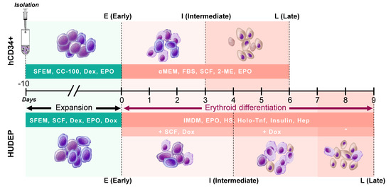 hCD34+ cells were isolated from PB of healthy individuals by magnetic-activated cell sorting, after mononuclear cell isolation using a density gradient medium and according to a published protocol (Protocol C) [110]. Briefly, PB was collected in K2EDTA tubes (Greiner Bio-One, Kremsmünster, Austria) and mixed with 1.5 blood-volumes of Dulbecco’s Phosphate-Buffered Saline (PBS) without calcium chloride and magnesium chloride (Sigma-Aldrich, Munich, Germany), and then carefully overlaid on top of 1.25 blood-volumes of Lymphoprep medium (Axis-Shield, Dundee, UK). After centrifuging at 900× g for 40 min without brake, the interphase, consisting of mononuclear cells, was harvested, washed 3 times in PBS, twice by centrifugation at 300× g for 5 min and once at 200× g for 5 min. The cell pellet was then resuspended in 600 μL ice-cold 1% bovine serum albumin (BSA) (Sigma-Aldrich, Munich, Germany) in PBS and incubated for 15 min with 100 μL CD34 MicroBead from CD34+ MicroBead Kit, human (Miltenyi Biotec, Bergisch Gladbach, Germany), on a rocking shaker at 4 °C. After two washes with ice-cold beading buffer (BB) (0.5% BSA, 2 mM EDTA in PBS) and centrifugation at 300× g for 5 min at 4 °C, the cell pellet was resuspended in 1 mL BB (without EDTA). Magnetic cell separation was carried out using LS columns placed on the QuadroMACS Separator on a MACS MultiStand (all from Miltenyi Biotec, Bergisch Gladbach, Germany). LC column was equilibrated with 5 mL BB, and then cells were loaded onto the column in two consecutive steps with an intervening BB column washing step. Cells were eluted from the column with 5 mL BB (by flushing with the plunger) and for the second round of selection were loaded onto a new equilibrated column to enrich further for hCD34+ cells. Cells were again eluted with 5 mL BB and collected by centrifugation at 300× g for 5 min. Isolated cells were then expanded in StemSpan SFEM II (Stem Cell Technologies, Vancouver, Canada) supplemented with 1 µM Dexamethasone (Sigma-Aldrich, Munich, Germany), 2 IU/mL EPO (Binocrit 4000 IU/0.4 mL, Sandoz GmbH, Kundl, Austria), 1% StemSpan CC100 (Stem Cell Technologies, Vancouver, Canada) and 1× Penicillin-Streptomycin (Thermo Fisher Scientific, Waltham, MA, USA) at concentrations below 0.5 × 106 cells/mL for ten days. The medium was changed twice a week. For the induction of erythroid differentiation, cells were cultured in Minimum Essential Medium Eagle, Alpha modification (Sigma-Aldrich, Munich, Germany) supplemented with 30% Defined Fetal Bovine Serum (Hyclone, Logan, Utah, USA), 10−5 M 2-Mercaptoethanol (Sigma-Aldrich, Munich, Germany), 10 IU/mL EPO (Binocrit 4000 IU/0.4 mL, Sandoz GmbH, Kundl, Austria) 10 ng/mL hSCF (PeproTech, Rocky Hill, USA) and 1× Penicillin-Streptomycin (Thermo Fisher Scientific, Waltham, MA, USA) at a concentration of 0.5–1 × 106/mL for six days. Again, cell counting was performed manually using a hemocytometer, and cell viability was measured using Trypan Blue Solution, 0.4% (Thermo Fisher Scientific, Waltham, MA, USA).