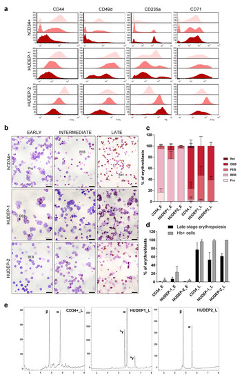 Morphologically, both primary hCD34+ cells and HUDEP erythroid cell lines progressed through the recognizable erythroblastic stages, with polychromatophilic erythroblasts and fewer orthochromatophilic erythroblasts already appearing by day 3 for hCD34+ and by day 4 for HUDEP cells (_I). At the end of erythroid differentiation (_L), hemoglobin-producing cells comprised the majority of cells in hCD34+, HUDEP-1, and HUDEP-2 cell cultures (96.0%, 98.4%, and 99.8%, respectively). At this stage, orthochromatophilic erythroblasts with pyknotic nuclei and enucleated cells prevailed in primary cell cultures, whereas poly- and orthochromatophilic erythroblasts were the predominant cells in HUDEP cell cultures, in the absence of enucleation (Figure 2b). Differential counting of erythroid subpopulations for _E and _L samples (total numbers of cells counted were 1647 for CD34_E, 1047 for HUDEP1_E, 1995 for HUDEP2_E, 1670 for CD34_L, 908 for HUDEP1_L, and 1179 for HUDEP2_L) indicated a greater differentiation potential of hCD34+ cells as shown by the cell fraction of late-stage erythroid differentiation (orthochromatophilic erythroblasts and reticulocytes); however, differences between cell types were not statistically significant (Figure 2c,d). Moreover, cell death, as evaluated by trypan blue assay, was higher in late-stage HUDEP-1 and HUDEP-2 cultures (≈67% and ≈52%, respectively) compared to late-stage primary cell cultures (15%). The above observations are attributed to the documented inherent inefficiency of differentiation of HUDEP cells and the reduced cell viability accompanying the withdrawal of doxycycline in cultures [36,39].
