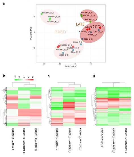 For pairwise comparisons of interest (same-stage expression between cell types, and late- vs. early-stage expression for each cell type) we performed differential expression analysis of all known and novel miRNAs using DEGseq [47]. For this analysis, DE miRNAs were defaulted as miRNAs with a false discovery rate (FDR) < 0.001 and a fold change (FC) ≥ 2 up or down (|log2 FC| ≥ 1). Of note, all log2 FCs cited in this article were statistically significant with a p-value <1.00 × 10−300, unless stated otherwise. Hierarchical clustering of all known and novel DE miRNAs confirmed the result of PCA, showing the relatedness between hCD34+ and HUDEP-2 cells as captured at both early and late stages of erythroid differentiation (Figure 3b,c). When samples were analyzed for changes in miRNA expression upon induction of erythroid differentiation (_L vs. _E), HUDEP-1 and HUDEP-2 cells clustered together and separately from hCD34+, although the inter-cluster variance was, in that case, low (Figure 3d), indicating an overall common erythroid differentiation signature for all three cell types. The top 60 most variable known miRNAs across cell types and stages, as defined by the standard deviation (SD) of expression, were sorted by descending average expression and plotted in a heatmap (Supplementary Figure S2).