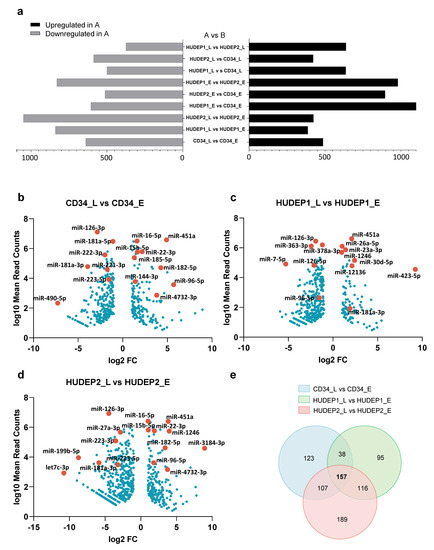 To identify miRNAs that are dynamically expressed during erythropoiesis, we looked for known and novel DE miRNAs between _L and _E samples. Evidently, more miRNAs were downregulated than upregulated in the late stages of erythroid differentiation in all cell cultures (Figure 4a). Consistent with progressive nuclear and chromatin condensation and downregulation of global gene expression after erythroid lineage commitment [48,49], our data revealed a restricted pattern of global miRNA expression and a reciprocal increase of the expression of individual lineage-specific miRNAs in terminal stages of erythropoiesis. This finding mirrors at the miRNA level what has been observed at the mRNA level, i.e., that less differentiated cells retain a poised cell state that is characterized by transcriptional complexity [50], and indicates active regulation of the cell state by a large repertoire of miRNAs.