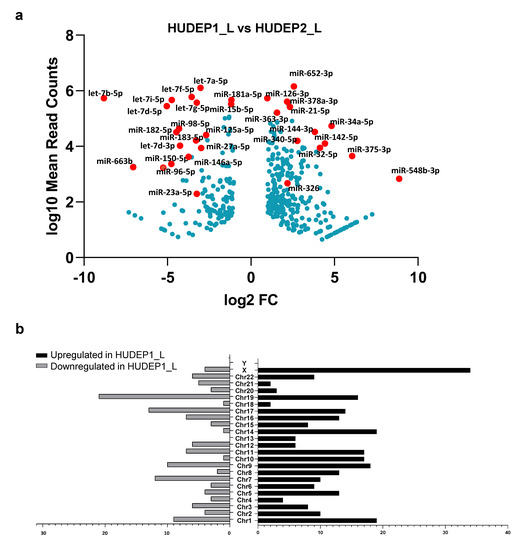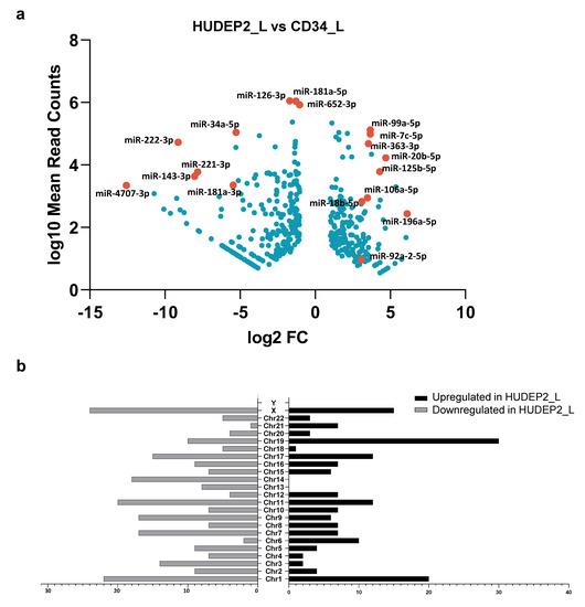Differential expression analysis in HUDEP2_L vs. CD34_L for known miRNAs. DEGseq highlights differences between primary cells and a prevalent cell model. (a) Differentially expressed (DE) known miRNAs in HUDEP2_L vs. CD34_L. Fold changes were plotted as the log2 FC of miRNA expression in samples against the log10 mean normalized miRNA counts calculated by differential expression analysis to aid legibility, only a selection of miRNAs of interest and DE miRNAs with high fold change or high levels of expression are labeled (see Table S8 for a full list). (b) The number of HUDEP2_L vs. CD34_L DE known miRNAs located in different chromosomes.