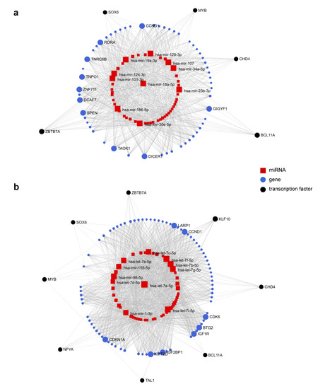 TF-miRNA co-regulatory networks illustrating the “multiple-to-multiple” pattern of miRNA interaction. Networks were extracted from miRNet using key erythroid transcription factors and DE miRNAs as input (accessed 12/2020). Analyses were performed in line with miRNet recommendations to limit network size (<2000 nodes), i.e., the “Data Filter” function was used, based on the network topology measures—degreed, betweenness, and shortest path. In this context, the degree of a node is the total number of connections it has to other nodes, and high-degree nodes are considered important “hubs” in a network (set to the default 1.0 here). The betweenness measures the number of shortest paths going through a node, and nodes with higher betweenness are important interactors in a network (set to 1.0 here). The shortest path filter helps reduce the complexity of a network by keeping only one, the shortest, path between hub nodes, i.e., in the presence of multiple paths connecting two nodes, only the shortest path will be retained (applied here). In the figure, node size indicates betweenness centrality, with large symbols highlighting hub nodes. The components shown are (from inside out) input miRNAs mapped to a network, miRNet-identified target genes, and input TFs mapped to a network, as indicated with corresponding symbols. (a) TF-miRNA co-regulatory network of known miRNAs upregulated in HUDEP1_L. (b) TF-miRNA co-regulatory network of known miRNAs upregulated in HUDEP2_L.