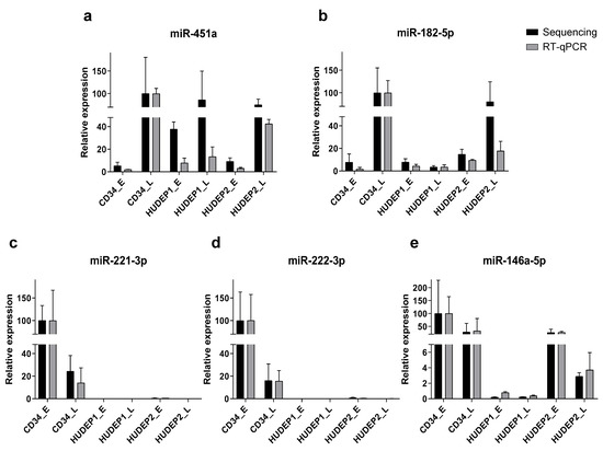 Five miRNAs, miR-451a, miR-182-5p, miR-146a-5p, miR-221-3p and miR-222-3p, showing significant expression variation between sample groups, were selected to verify the sequencing results by RT-qPCR in the same samples. The expression patterns of the five miRNAs were quantified by stem-loop RT-qPCR and plotted along with the corresponding sequencing data for comparison (Figure 8). MiR-451a was verified as associated with erythroid maturation, showing significant upregulation in hCD34+ (CD34+_L vs. CD34+_E log2 FC = 5.64, p = 2.91 × 10−4) and HUDEP-2 cells (HUDEP-2_L vs. HUDEP-2_E log2 FC = 3.87, p = 2.68 × 10−3), while miR-182-5p was significantly upregulated only during erythroid maturation of hCD34+ (CD34+_L vs. CD34+_E log2 FC = 6.82, p = 8.05 × 10−3). We also confirmed the minimal expression of miR-221-3p and miR-222-3p in HUDEP cells as well as the differential expression of miR-146a-5p between fetal-like HUDEP-1 and adult-like HUDEP-2 cells (HUDEP1_L vs. HUDEP2_L log2 FC = −3.15, p = 1.29 × 10−2 and HUDEP1_E vs. HUDEP2_E log2 FC = −5.09, p = 4.83 × 10−5).
