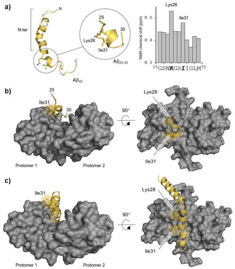 Molecular representations of Aβ42, Aβ25–35, S100B, and the main experimental data which guided the molecular docking procedure. (a) Aβ42 peptide cartoon structure (Protein Data Bank, PDB entry 1Z0Q) obtained from NMR in a 30/70 ratio solution of hexafluoro-2-propanol/water [] (Lys28 and Ile31 residues are depicted in sticks to highlight their spatial proximity) and the NMR-based experimental evidence showing Lys28 and Ile31 interacting with S100B (redrawn from NMR interaction data from []). (b) Haddock solution used in this study with the Aβ25–35 structure located in the S100B (grey surface) binding cavity. (c) Full-length Aβ42 rebuilt from the Haddock solution in α-helical conformation. N-ter: N-terminus.