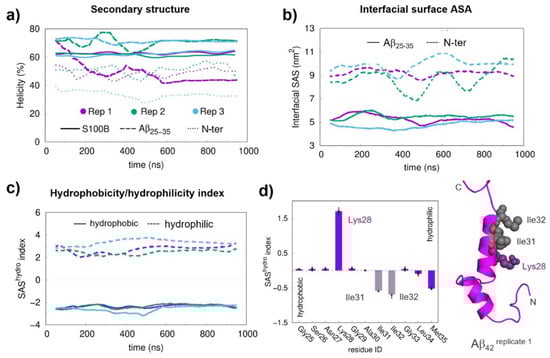 Structural equilibration properties, the hydrophobicity/hydrophilicity (SAShydro) index, and the final conformations for the long molecular docking (MD) simulations. (a) Helical content of S100B, Aβ25–35 and AβN-ter during production MD runs. (b) Interfacial area between Aβ25–35/AβN-ter and S100B. (c) SAShydro indexes for the Aβ25–35 region at the interface. (d) Average SAShydro index values for the hydrophobic and hydrophilic residues in the Aβ25–35 segment. A floating window of 100 ns was used in the time series to reduce the local fluctuations. The final interfacial Solvent Acessible Surface Area (SASA) values were obtained by averaging the two interfacial areas, one mapped on the protein and another mapped on the peptide surface. The hydrophobic and hydrophilic residues in the SAShydro index calculations were separated based on their sign (positive for hydrophilic and negative for hydrophobic residues). The average SAShydro index values were obtained from the equilibrated segments (the last 450 ns). The error bars were calculated from the standard error of the mean between replicates. A representative structure of the Aβ42 peptide is shown in the cartoon with the most relevant residues, in terms of SAShydro index values, represented with spheres.