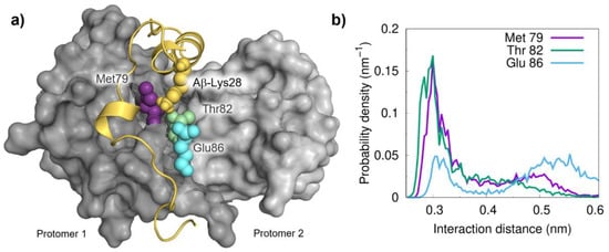 Following the detection of a significant role for Aβ-Lys28 in the interaction, we next developed a procedure to identify preferential contacts based on a distance threshold (0.35 nm) between this residue and those in S100B. Using this approach, the analysis of the final equilibrated complexes allowed us to identify three residues that persistently interact with Lys28: Met79, Thr82 and Glu86. All these residues are located on helix IV at the S100B binding cleft, and this ensemble likely forms a diffuse binding hotspot (Figure 3a). In agreement, the calculated probability density distributions obtained from the simulations perfectly capture these interactions (Figure 3b). Interestingly, the presence of Glu86 at the interaction interface suggests that this residue in S100B likely acts as an electrostatic anchor to stabilize the interaction with Aβ via its Lys28.