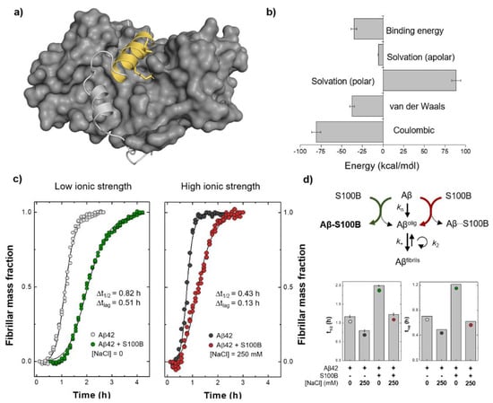 Finally, we set out to experimentally explore the potential role of coulombic interactions on S100B:Aβ42 complex stabilization. We tested the inhibitory effect of S100B over Aβ42 aggregation under low and high ionic strength conditions (Figure 4c). Indeed, at a five-fold excess ratio, we observed that S100B anti-aggregation activity, measured by an increase in the time required for the formation of 50% of fibrillar mass (t1/2), was significantly lower in the presence of 250 mM NaCl when compared with the appropriate controls in the absence of salt (Figure 4d). Since NaCl itself displayed an accelerating effect on Aβ42 aggregation, the S100B activity decrease might be better depicted by the difference (Δt1/2) in the increasing t1/2 due to the presence of the inhibitor (Figure 4c inset). The ionic strength-dependent depletion of S100B activity was even more remarkable when we compared the lag/pre-transition times (tlag)—here defined as the highest measured time where the fibrillar mass was lower than 10%—in both conditions (Figure 4c inset and Figure 4d). Lag phase duration is highly dependent on the rates of primary and secondary nucleation, as well as fibril elongation []. Moreover, a decrease in the concentration of free monomeric Aβ42 as caused, for instance, by binding to an inhibitor, may strongly affect the rates associated with all these mechanisms. This dependence is especially noticeable in the primary nucleation reaction, which comprises the association and structural conversion of monomers in solution to form the first smallest fibrillar aggregates that can be further extended by elongation []. A minor tlag change associated with a lower transition/exponential phase slope in the presence of an aggregation inhibitor, as observed for S100B under high ionic strength conditions, is typical of the quasi-selective inhibition of secondary nucleation promoted by the interaction of the chaperone with fibril surfaces, and not monomers []. Therefore, our results also suggest that S100B association with Aβ42 fibrils is driven by a different set of intermolecular forces that can be established even at high ionic strength. Altogether, and accounting for the fact that S100B holdase activity requires, at least partly, proper interaction with its client peptide in the monomeric state, the aggregation kinetic outcomes support the meaningful role of coulombic interactions for the formation and maintenance of S100B:Aβ42 complexes as suggested by molecular simulation experiments (Figure 4d, top).