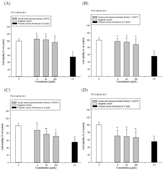 Effects of direct treatments with guava seed polysaccharides (GSPS) (A), GSF1 (B), GSF2 (C), and GSF3 (D) for 24 h on PC-3 cell growth. Values are means ± SD (n = 6 biological determinations). Bars in the plot not sharing a common letter are significantly different (p < 0.05) from each other analyzed by one-way ANOVA, followed by Duncan’s multiple range test. Each cell population (2 × 105 cells/mL) was respectively treated with the polysaccharides at the indicated concentrations of 8, 40, and 200 μg/mL, as well as paclitaxel (a positive control) at 2.5 μM. The cell viability was determined using MTT assay.