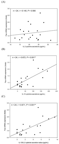 To correlate the cytokine secretion profile by immune cells (splenocytes and macrophages) and Fas mRNA expression levels in the corresponding treated PC-3 cells, the relationships were respectively analyzed using Pearson’s correlation coefficients (r). We observed that there was no significant correlation (r = 0.140, p = 0.566) between IL-2 (Th1 cytokine) secretion levels in SGSF3 media and Fas mRNA expressions in the corresponding treated PC-3 cells (Figure 5A). Most importantly, there are significant (p < 0.05) positive correlations between IL-10 (Th2 cytokine) secretion levels (r = 0.672, p = 0.001; Figure 5B), as well as IL-10/IL-2 (Th2/Th1 cytokine secretion ratio) (r = 0.671, p = 0.001; Figure 5C) and Fas mRNA expression levels in the corresponding treated PC-3 cells. It is suggested that Th2-polarized cytokines secreted by splenic T cells in the PC-3 tumor microenvironment may increase Fas mRNA expression levels in the corresponding treated PC-3 cells, possibly subsequently causing PC-3 cells’ apoptosis induced by Fas ligand (FasL)-bearing cells such as CD8+ T cells.