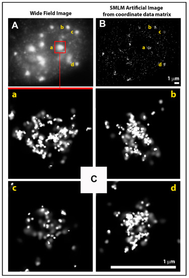 SMLM is one of the recently developed methods of super-resolution microscopy derived from spectral precision distance microscopy which was invented about 25 years ago [71,72,73]. In addition to the molecular optical resolution, the huge advantage of SMLM can be seen in its user friendliness and application versatility—the method utilizes the same technique of sample preparation and labeling as the standard optical widefield/confocal microscopy [54,55,58,67,74]. The only indispensable requirement for specimen preparation is the use of fluorochromes that must “blink” after the initial high-energy laser illumination; i.e., the fluorochrome molecules must exert reversible photobleaching during data acquisition [75,76]. This possibility of “routine” immunofluorescence staining provides a unique opportunity to study the same samples by using standard widefield/confocal microscopy and SMLM, and thereby obtain correlated results for given specimens on the micro-, meso-, and nano-scale level [54,58,67].