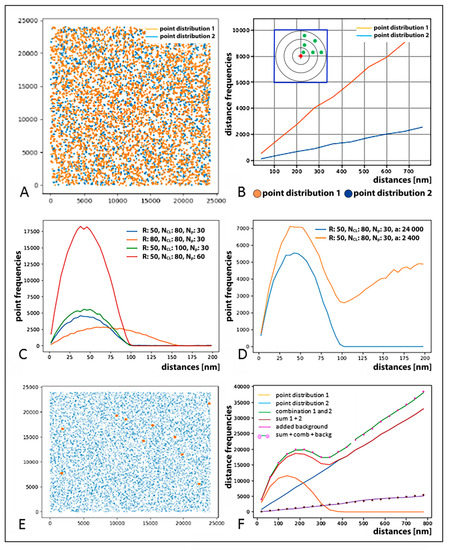 In the following, we present how, instead of processed images, mathematical procedures and algorithms applied on the raw coordinate data of the detected specific labeling points can lead to a better quantitative understanding of chromatin rearrangements and repair protein recruitment and trafficking, thereby elucidating spatial conformation-driven processes, potentially also involving repair pathway decision-making procedures. The basic information for all further calculations and biological mechanistic interpretations is a table of coordinates (±measurement errors) of molecular blinking events extracted from the acquired time stack of image frames. To examine the spatial architecture and configurations of the studied labeled molecules (markers of DSBs, heterochromatin, etc.), pairwise point distances and their frequencies are analyzed. A well-established procedure for this purpose is the application of Ripley’s pattern analysis for structuring criteria [10,67,81,82]. The number of distances from each point to each other point is plotted in a frequency histogram. The shape of such histograms reflects the structural organization within the point pattern acquired, as explained in Figure 2.