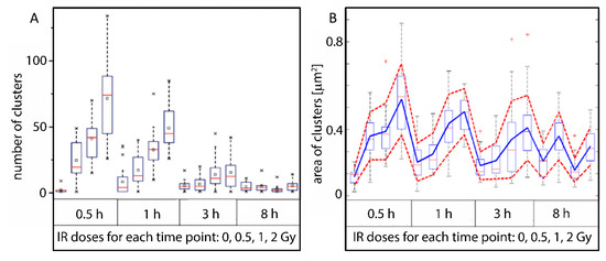 (A) Number of γH2AX clusters detected per cell vs. radiation dose and time PI (the figure is reproduced from [58] with permission from the Royal Society of Chemistry). HeLa cells were irradiated with 240 kV X-rays at different doses ranging from 0 (control) to 2 Gy. After irradiation, aliquots of the irradiated cell cultures were fixed at the given time points (0.5 to 8 h PI) and labeled with antibodies against γH2AX. (B) Areas of detected clusters calculated for different doses and times PI. The boxplots show the median values (red line), the lower and upper quantile (box), and ± 2 standard deviations from the mean value (dashed bar); the x symbols (panel (A)) indicate the maximum and minimum values; the red cross symbols (panel (B)) indicate the outliers.