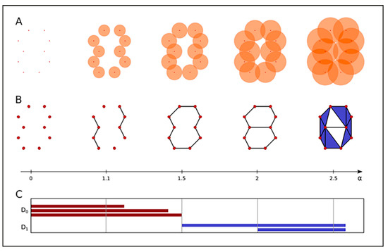 Persistent topology analysis and the barcode data representation. (A) Continuously growing spheres (orange) around the signal point data, exemplarily shown for five different radius (α) scales, illustrate the idea of the α-shape filtration (i.e., “component” formation). (B) As the growing spheres mutually contact each other, the corresponding sphere centres (i.e., the involved signal points) are connected by an edge. Whenever a triangle is formed, it is included in the complex as a face element. (C) Barcodes (Betti numbers) of dimension 0 (D0) and 1 (D1) corresponding to connected components (dark red bars) and holes (blue bars). For detailed explanations, the article by Hofmann et al. [79] is recommended. Note: This figure explains Figure 1F in detail.