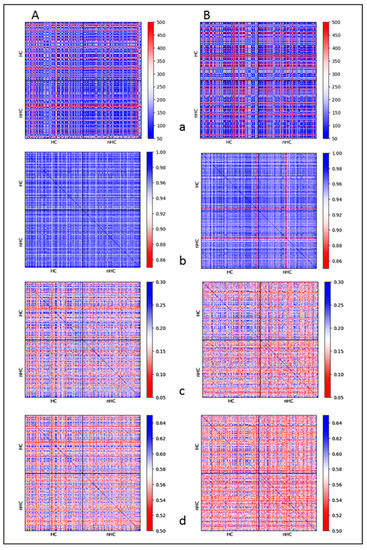 Heat maps comparing the similarity of HC- and nHC-associated γH2AX clusters for two datasets of irradiated HeLa cells. (A) 0.5 h PI; (B) pooled datasets of 1 h plus 8 h PI. Comparison of sizes (a); topologies of dimension 0 (=components) (b); topologies of dimension 1 (=holes) (c); and averaged topology similarity measures for the dimension 0 and 1 (d). In these heat maps, the upper left quarter mutually compares all the HC-associated clusters and the lower right quarter mutually compares all the nHC-associated clusters. The upper right and lower left quarters then both compare nHC-associated clusters with HC-associated clusters. The arrangement of the individual HC- and nHC-associated clusters along the x and y heatmap axes is random but the order of clusters is the same for both axes; hence, a blue diagonal of topological identity can be seen, wherein the individual clusters are compared to themselves. The color codes of the heat maps mean red for dissimilarity and blue for similarity. As a measure of the similarity of the size, the difference in the size of two clusters was used so that a small difference corresponds to great similarity. Data for 0.5 Gy and 1.0 Gy X-rays were pooled into one dataset to increase statistical significance as the results were shown not to depend on dose. It can be seen that γH2AX clusters are mutually more similar in the shorter PI period (0.5 h) and also if they “colocalize” with heterochromatin (compared to euchromatin). See the text for details. Note: This figure is a typical example for the illustration in Figure 1H.