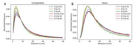 Relative frequency of the endpoints of dimension zero and dimension one bars (for details, see Figure 6 and the explanation in the text). The normalized histogram of the distribution of the endpoints of the bars representing the persistence of (A) components and (B) holes is shown for non-irradiated HeLa cells and samples irradiated with 0.5 Gy X-rays and fixed at different time points post-irradiation. For each treatment, the average of the normalized histograms of the different nuclei is shown.