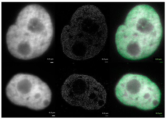 Computed images of two HeLa cell nuclei 30 min after irradiation with 2 Gy X-rays and SMLM of antibody-labeled heterochromatin (green) and γH2AX (red). The artificial images were prepared from the localization matrices (i.e., matrices of signal coordinates and localization errors) obtained for green and red signals. The intensity of the green signals is encoded by the next neighbor density of signals (clustered signals, herein the chromatin domains, are therefore brighter) whereas the red signals are merged into coherent clusters. Blue signals correspond to signal overlap of the two channels. Note that these images were artificially prepared from point data of two color channels by mathematical data processing (see Figure 1 for general description of the whole procedure). Note: Parts of this figure are shown in Figure 1I.