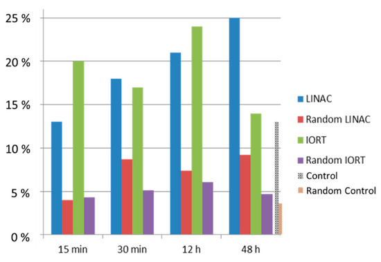 Nucleosome cluster formation after irradiation of GFP-H2B-labeled HeLa cell nuclei with a dose of 3.5 Gy (X-rays) at energies of 6 MeV (LINAC) or 50 keV (IORT). Comparison to random H2B distribution is also provided. In the non-irradiated control cells (shown at 48 h of cultivation), 13% of signals followed the cluster criterion. See text for further details.