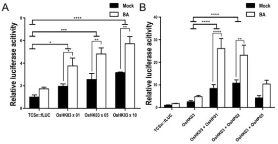 2.4. The CK Receptor OsHK03 Requires OsHPs to Induce the TCSn:fLUC Reporter