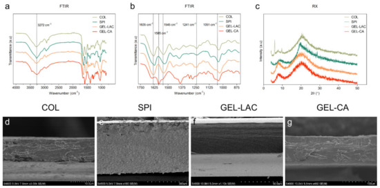 FTIR spectra of films (a) from 4000 to 850 cm−1 and (b) from 1750 to 850 cm−1. (c) XRD patterns of films. (d–g) SEM image sections of films obtained with (d) 3000×, (e) 180×, (f) 1100×, and (g) 450× magnification. COL, collagen; SPI, soy protein isolate; GEL-LAC, lactose-cross-linked gelatin; GEL-CA, citric acid-cross-linked gelatin.
