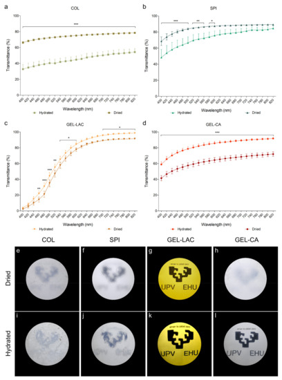 COL (Figure 2a) and SPI (Figure 2b) films showed the lowest transmittance values, the dried films being more translucent than the hydrated ones. The differences in light transmission values between the dried and hydrated SPI films decreased as the wavelengths increased, and the differences were no longer statistically significant from 620 nm on. However, the dried collagen film transmitted around 30% more light than the hydrated sample across the entire visible spectrum. In both dried and hydrated SPI films as well as in dried COL films, around 60–80% of light was transmitted in almost all the wavelengths of the visible spectrum. However, the photographs showed blurred patterns, meaning that these films were translucent and allowed the passage of light but did not allow objects placed at a certain distance to be focused clearly (Figure 2e,f,i,j).