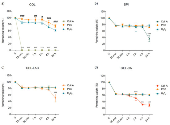 In vitro degradation of the films immersed in 200 ug/mL collagenase A solution or PBS alone at 37 °C over time. Films immersed in distilled water at 37 °C were used as control. (a) represents the degradation profiles of COL films; (b) the degradation profiles of SPI films; (c) the degradation profiles of GEL-LAC films and (d) the degradation profiles of GEL-CA films. Data are reported as means ± SD, and statistically significant differences of films in collagenase A (*) and PBS (#) are reported with respect to those in distilled water. * p < 0.05, ** p < 0.01, *** p < 0.001; # p < 0.05, ## p < 0.01, ### p < 0.001; n = 3.