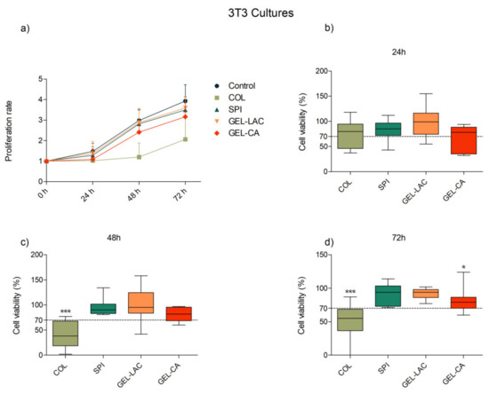 Effects of film composition on the (a) proliferation and (b–d) viability of 3T3 cells. Cells seeded in p96-well plates were exposed to each film for 24, 48, and 72 h. Cells seeded on wells without any biomaterial were used as controls. Proliferation results are represented as proliferation rate mean ± SD of viable cells compared with viable cells at t = 0 h. Viability results are expressed as percentages of viable cells in relation to control wells (100% viability). The lines drawn inside each box represent the medians of viability values of each film. Statistically significant differences showed differences with respect to control (* p < 0.05, ** p < 0.01, *** p < 0.001; n = 9).
