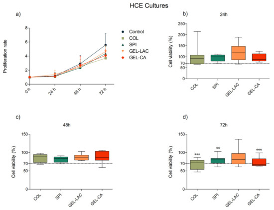Results concerning HCE cultures also showed a time-dependent proliferation pattern in all cases (Figure 5). Better proliferative pattern and higher viability values were recorded in the HCE-containing wells conditioned with COL films compared with 3T3 cultures. Except for 72 h, when 60% of viability was registered, the viability was much higher than 70% at 24 and 48 h. Even so, the values recorded for COL films were the lowest compared with the other films. The viability recorded for SPI, GEL-LAC, and GEL-CA was well above 70% in all cases.
