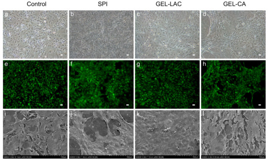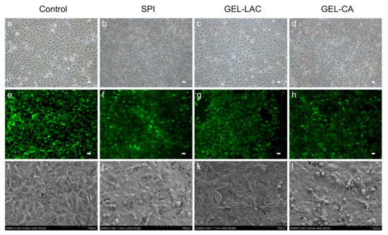 Cell adhesion and film cyto-compatibility were studied by cell culture observations through the phase contrast microscope, performing the Calcein AM/Ethidium homodimer-1 live/dead assay (EthD1) at different time points (24, 48, and 72 h) and through scanning electron microcopy (SEM) images. The 3T3 cells seeded on SPI, GEL-LAC, and GEL-CA films showed similar cell morphology to the control treatment. They presented the typical bi- and multipolar branched morphology of fibroblasts (Figure 6a–d). Regarding the disposition over the films, a flat and elongated monolayer configuration similar to the control was observed in SPI and GEL-LAC films. However, the cells were arranged in patches in GEL-CA films rather than in a monolayer. Regarding the live/dead Calcein AM-EthD1 assay, very few dead cells were observed above the films; around 1–5% of the cells adhered to the films were stained with EthD-1 (Figure 6e–h). These values were maintained until 72 h. The images taken through SEM showed a very flat and stretched arrangement of these cells over the films. At high magnification, nonsignificant morphological differences were observed among the different samples (Figure 6i–l).