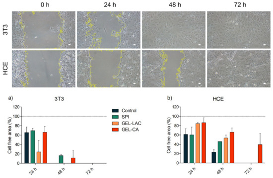 The ability of both cell types to migrate over the films was assessed creating a cell-free gap and recording the time of the gaps’ closure at 0, 24, 48, and 72 h. Technical replicates made with each film type showed the ability of both cell types to migrate over biomaterials. The gaps were closed faster with 3T3 cells than with HCE cells. In both cases, the cells seeded on GEL-CA were the ones that took a longer time for gaps to close; however, all the culture ended up covering the cell-free area by 72 h (Figure 8). As with adhesion assays, it was not possible to cultivate any cell type in COL films.
