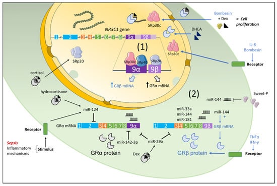 General overview of the transcriptional induction of GRβ. (1) Regulation of GRβ expression by serine–arginine proteins (SRps): While exon 9α is predicted to have more binding sites for SRp30c and SRp40, exon 9β possess more binding sites for SRp20. Elevated activity of SRp30c and SRp40 on exon 9α would increase exon 9β splicing and thereby the generation of GRβ mRNA. Alternatively, more binding sites for SRp20 on exon 9β would increase exon 9α and thereby the GRα mRNA splicing. Experimental evidence demonstrates that mediators, such as IL-8 in neutrophils or bombesin in PC3 cells, increase the levels of SRp30c, which enhances the alternative splicing of GR pre-mRNA to generate GRβ mRNA. Treatment with dexamethasone in the presence of bombesin resulted in increased cell number as compared to dexamethasone alone. Moreover, while dehydroepiandrosterone (DHEA) induced the upregulation of GRβ by increasing the expression of SRp30c, cortisol enhanced SRp20 to promote GRα. Therefore, changes in SRps expression result in a differential GRα/GRβ ratio. (2) Regulation of GRβ expression by microRNAs (miRNAs): Emerging evidence suggests that miRNAs differentially target GRα or GRβ transcripts. GRβ expression is directly regulated by targeting miRNAs that specifically binds GRβ or indirectly by miRNAs that downregulated GRα expression. While miR-33a and miR-181a/b/c/d were predicted to specifically bind the 3′UTR of human GRβ (hGRβ), where miR-144 significantly upregulated the expression of GRβ in bladder cancer cells, miR-124 and miR-142-3p specifically targeted GRα and augmented the expression of GRβ in T cells. In contrast, dexamethasone induced miR-29a, which reduced both GRα and GRβ in human and mouse adipose tissue. Inflammatory signals but also GC treatment promote the increase in miR-124 and miR-142-3p, activating a negative feedback loop that promotes GC resistance through imbalance of the GRα/GRβ ratio. Targeting miR-144 with Sweet-P significantly reduced the expression of GRβ mRNA in human bladder cancer cells. Blue arrows depict direct effects on GRβ expression, whereas black arrows depict indirect effects through the downregulation of GRα. The figure is based on References [15,25,26,27,28,29,30,31,32,33,34,35]. Parts of the figure were created using templates from Servier Medical Art, which are licensed under a Creative Commons Attribution 3.0 Unported License (http://smart.servier.com/). Last accessed on 20 January 2021.