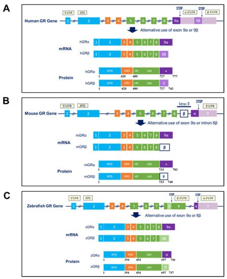 Structure of the GR gene, mRNAs, and proteins in different species. Alternative splicing of the GRβ primary transcript differs among species. (A) The human GR gene contains the exons 9α and 9β, which are alternatively spliced near the end of the primary transcript to generate GRα and GRβ mRNAs. GRα originates by joining the end of exon 8 to exon 9α, whereas GRβ is produced by an alternative acceptor site, where exon 8 is joined to the downstream exon 9β. The originated proteins share identical amino acids up to position 727, and thereafter, the C-terminal of GRα contains 50 additional amino acids (777 aa protein), whereas the C-terminal of GRβ contains 15 additional amino acids (742 aa protein). (B) The mouse GRβ (mGRβ) arises from an alternative donor site located within intron 8, rather than exon 9 as in humans. mGRα and mGRβ share identical amino acids up to position 733, and thereafter mGRβ possess 15 additional amino acids (748 aa protein). Likewise, rat GRβ originates from inclusion of intron 8. (C) In zebrafish, GR isoforms originate from intron retention, where zebrafish GRβ (zGRβ) arises from alternative use of a splice donor site in exon 8. The zGRβ protein contains 737 amino acids and shares the N-terminal 697 amino acids with zGRα. The figure is modified and based on References [14,42,44] and copyright permission was obtained from Oxford University Press and Copyright Clearance Center for reference [42].