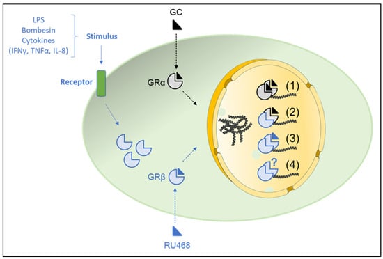 Possible mechanisms of action for GRβ. The GC function is mediated by GRα or GRβ. Different pro-inflammatory stimuli, such as TNFα, IFNγ, IL-8, or LPS, induce GRβ expression. GRβ is localized both in the cytoplasm and nucleus in a cell-type-specific manner. (1) Classic GC genomic effects mediated by GRα: Upon binding to GCs, GRα translocates into the nucleus where GRα homodimers bind to GREs to increase or decrease gene transcription. (2) GRβ dominant-negative activity on GRα: GRβ can translocate into the nucleus in a ligand-independent manner to either compete for GRE binding via their shared DBD or form inactive heterodimers with GRα. (3) GRβ binds RU486 to control gene expression: The synthetic GC antagonist RU486 might bind to GRβ and induce its nuclear translocation, where it modulates transcriptional activity independently of GRα. (4) Intrinsic activity of GRβ (unknown ligand): GRβ directly modulates the expression of a large number of genes independently of GRα. Hypothetical endogenous steroids might be involved in the nuclear translocation and the intrinsic activities of GRβ. Parts of the figure were created using templates from Servier Medical Art, which are licensed under a Creative Commons Attribution 3.0 Unported License (http://smart.servier.com/). Last accessed on 20 January 2021.