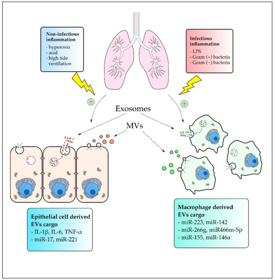 ALI may be induced by many infectious triggers including bacterial infection, lipopolysaccharide (LPS), and many more. Zhang et al. aimed to determine whether BALF-MVs collected during lung inflammation caused by LPS and Klebsiella pneumoniae contain regulators of the inflammation process. Levels of miR-223 and miR-142 in BALF-MVs and serum-derived MVs were highly elevated compared to the control. MiR-223 and miR-142 showed anti-inflammatory activity by targeting NLRP3 inflammasome components. Furthermore, in vitro studies with BMDMs and THP-1 monocytes after LPS and K. pneumoniae stimulation revealed a decrease in intracellular expression of miR-223 and miR-142 while the macrophages were activated. Moreover, MV-miR-223/142 mimics administered in mice pretreated with K. pneumoniae revealed decreased macrophage and neutrophil lung infiltration, suppressed inflammasome activity, and lowered expression of IL-1B and IL-18 in lung [60]. Another study conducted by Lee et al. showed that LPS and P. pneumoniae induced ALI with elevated levels of BALF-EVs that carried macrophage markers such as CD68. Researchers investigated whether BALF-EVs can promote an inflammatory response in mice lungs. However, BALF-EVs and EV-free BALF collected from an infectious ALI model independently augmented proinflammatory cytokine gene expression, which indicates that not only BALF-EVs but also soluble BALF factors are important for inflammation development. Moreover, BALF-EVs upregulated TLR6 (Toll-like receptor 6), TLR9, CD80, IL-1β, and IL-10 in recipient AMs [61]. Yuan et al. focused on the proinflammatory effect of BALF-EVs obtained from mice with LPS-induced septic lung injury. BALF-EVs from ALI mice had a significantly greater amount of miR-155 and miR-146a. Moreover, researchers confirmed by fluorescence microscopy that BALF-EVs were able to internalize into recipient epithelial cells. Furthermore, lung epithelial cells treated with BALF-EVs obtained from ALI mice overexpressed proinflammatory mediators such as TNF-α and IL-6 and downregulated the tight junction protein (TJP-1) [62]. Additionally, Soni et al. showed that LPS-induced macrophages release MVs that carry a high amount of TNF-αand can activate lung epithelial cells. Moreover, mice treated with LPS-induced macrophage-derived MVs exhibited acute lung injury features such as increased protein and neutrophils levels in BALF, overexpression of ICAM-1 on the surface of both I and II type epithelial cells, and increased concentration of keratinocyte chemoattractant (KC) (mice homolog of IL-8) in BALF [63]. The abovementioned studies indicate that EVs may play various roles during infectious acute lung injury. They may contribute to the reduction of anti-inflammatory factors inside inflammatory cells, resulting in their activation, or transport of proinflammatory factors—mainly from macrophages to the alveolar epithelial cells—which results in overexpression of proinflammatory cytokines and increased alveolar permeability.